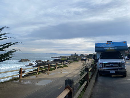 La route qui longe l'océan Pacifique est superbe, on se serait cru dans le sud de la France, vers Collioure, avec des routes entre collines et falaises. Allongée dans le lit, je ne perdais pas une miette du paysage à travers la fenêtre du CC. Nous sommes arrivés en fin de soirée à Monterey, ma petite ville préférée du voyage. On aurait dit une petite ville balnéaire comme Fouras, j’ai adoré la tranquillité de l’endroit. Nous nous sommes promenés dans le centre ville et nous sommes bien sûr allés voir la jetée. Finalement les jetées sont un peu l’épicentre des villes de la côte Ouest j’ai l’impression haha. Nous nous sommes arrêtés prendre l’apéro dans un pub français puis nous nous sommes achetés des plats à emporter. Au menu: Fish’n Chips, poulpe frit et huitres frites. Je n’ai pas été trop fan des beignets d’huîtres mais Papa a eu l’air de bien aimer alors bon haha… Nous avons ensuite trouvé un super spot pour dormir au bord de la mer avec le bruit des vagues pour bercer notre sommeil. Le lendemain matin, nous sommes allés nous promener le long des falaises, c'était une super promenade matinale, nous avons même pu apercevoir pleins d’otaries trop mignonnes. Avec Papa, nous sommes allés nous tremper les pieds dans l’eau et, en effet, elle était très froide haha.